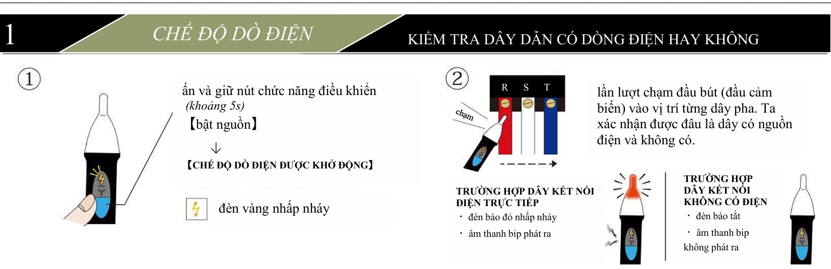 ‣ Chức năng phát hiện điện áp không tiếp xúc. Sau khi khởi nguồn, cài chế độ dò pha hoặc chế độ kiểm tra điện theo nhu cầu, người thao tác chỉ cần chạm đầu bút (đầu cảm biến) vào vị trí đo.