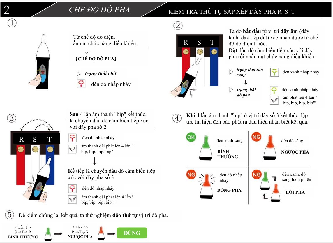 Bạn có thể kiểm tra trình tự các pha (thứ tự tạo ra lực điện động) trong đường dây phân phối ba pha - ba dây và ba pha - bốn dây. Nhận biết được đường dây nóng, đường dây lạnh