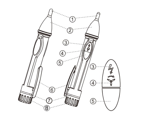 ① đầu đo, đầu kiểm tra cảm ứng ② vị trí đèn báo kết quả (đèn xanh, đèn đỏ) ③ chế độ kiểm tra điện (đèn vàng) ④ chế độ dò pha (đèn đỏ, đèn xanh) ⑤ nút chức năng điều khiển ⑥ khuy cài ⑦ vòng đệm ⑧ nắp pin |