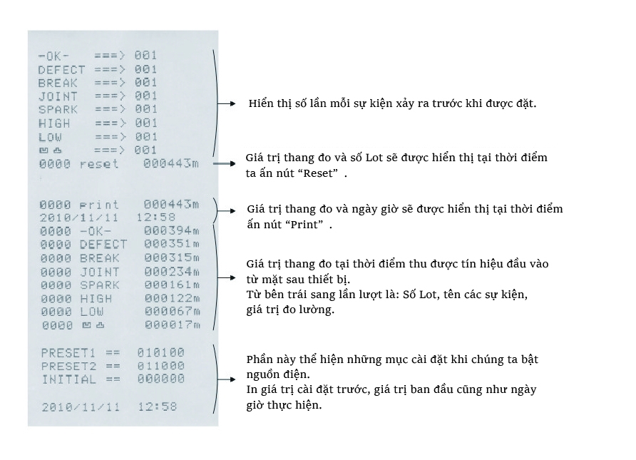 | Print sự kiện | Sử dụng công tắc mặt trước, khối đầu cuối phía sau, RS232C | ||
