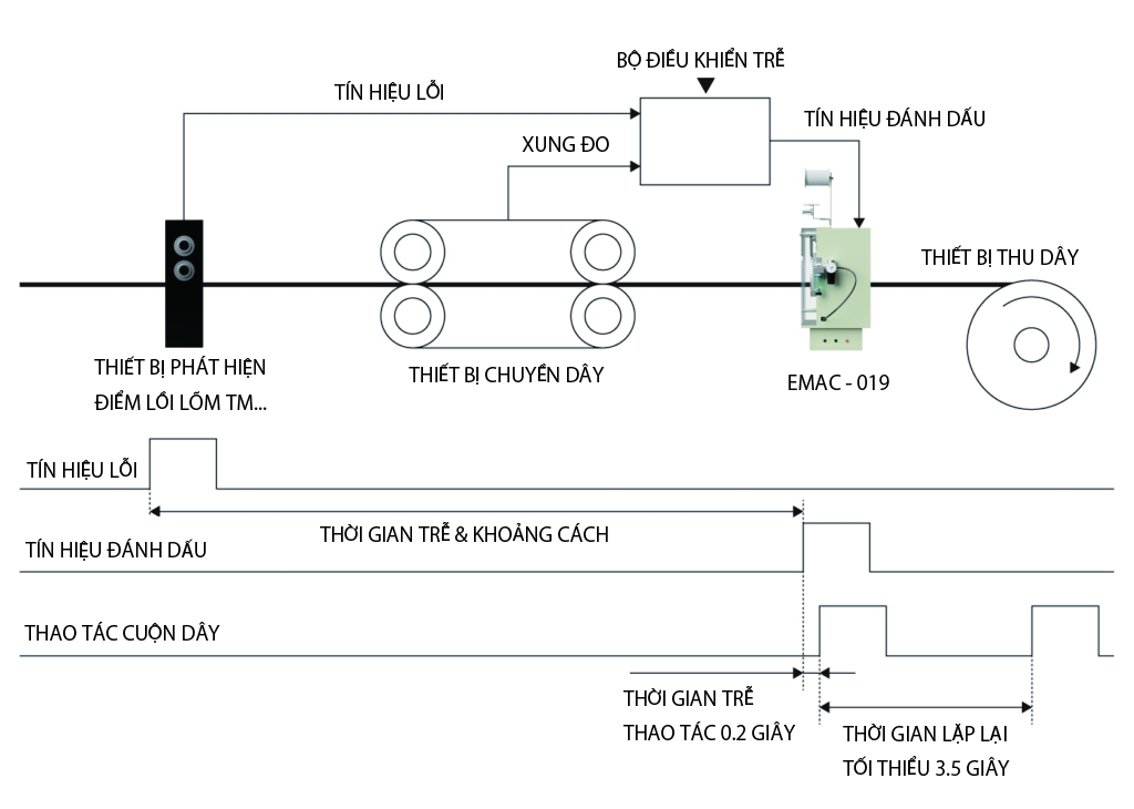 Khi tín hiệu báo điểm lỗi được nhận biết từ “Thiết bị phát hiện điểm lồi lõm TM, thiết bị phát hiện khuyết điểm bề mặt FM-L” sẽ có độ trễ trước khi tín hiệu truyền đến vị trí đánh dấu EMAC. Hãy sử dụng bộ điều khiển độ trễ với thông số cài đặt phù hợp về thời gian, khoảng cách để vị trí lỗi được đánh dấu đúng.